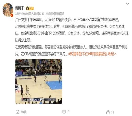 广东媒体人麦穗丰也评价了陈国豪的第二场季前赛:尽管比赛中体型上很吃亏,但陈国豪总是能想到得分的办法,努力帮助球队,连续两场面对NBA球队上双。